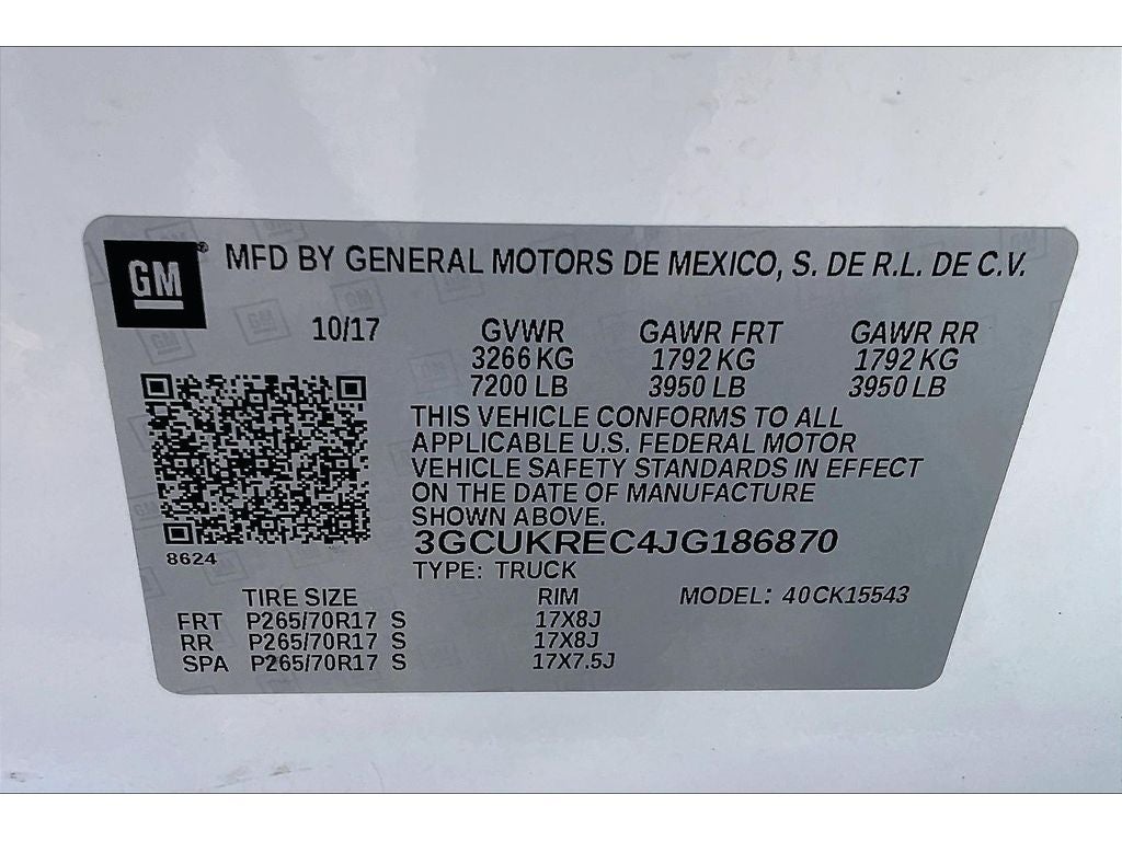 Preferred Equipment Group 1LT: Body Color Bodyside Moldings; EZ Lift and Lower Tailgate; Rear 60/40 Folding Bench Seat (folds Up); Cloth Seat Trim; Bluetooth® For Phone; AM/FM 8" Diagonal Color Touch Screen Radio; 17" X 8" Bright Machined Aluminum Wheels; 4.2" Diagonal Color Display Driver Info Center; Rear Chrome Bumper; 6 Speaker Audio System; Chrome Grille Surround; Remote Locking Tailgate; Front Chrome Bumper; 150 Amp Alternator; 40/20/40 Front Split Bench Seat; Steering Wheel Audio Controls; Color-Keyed Carpeting with Rubberized Vinyl Floor Mats; Power Windows with Driver Express Up; OnStar and Chevrolet Connected Services Capable; Remote Keyless Entry; Single Slot CD/MP3 Player; Body-Color Door Handles; 4WD Active Transfer Case; Deep-Tinted Glass; Body-Color Mirror Caps; HD Radio; Manual Tilt Wheel Steering Column; Body-Color Power Adjustable Heated Outside Mirrors; Leather Wrapped Steering Wheel with Cruise Controls; Driver and Front Passenger Illuminated Vanity Mirrors; Rear Wheelhouse Liners. Rear Under-Seat Composite Storage Bin. P265/70R17 AT BW Tires. **Equipment listed is based on original veh