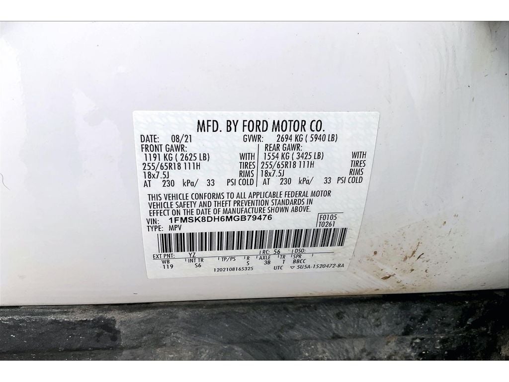 Ford Co-Pilot360 Assist+: Speed Sign Recognition; Voice-Activated Touchscreen Navigation System; Evasive Steering Assist; Intelligent Adaptive Cruise Control. Equipment Group 202A: 18" 5-Spoke Sparkle Silver-Painted Aluminum Wheels; Heated Steering Wheel; 3.58 Non-Limited-slip Rear Axle Ratio; ActiveX Captain's Chairs; 10-Speed Automatic Transmission; Acoustic-Laminated Front Side Windows; 2.3L EcoBoost I-4 Engine; P255/65R18 AS BSW Tires; 6. 160 lbs GVWR; AM/FM Stereo; LED Fog Lamps; Remote Start System. **Equipment listed is based on original vehicle build and subject to change. Please confirm the accuracy of the included equipment by calling the dealer prior to purchase.**