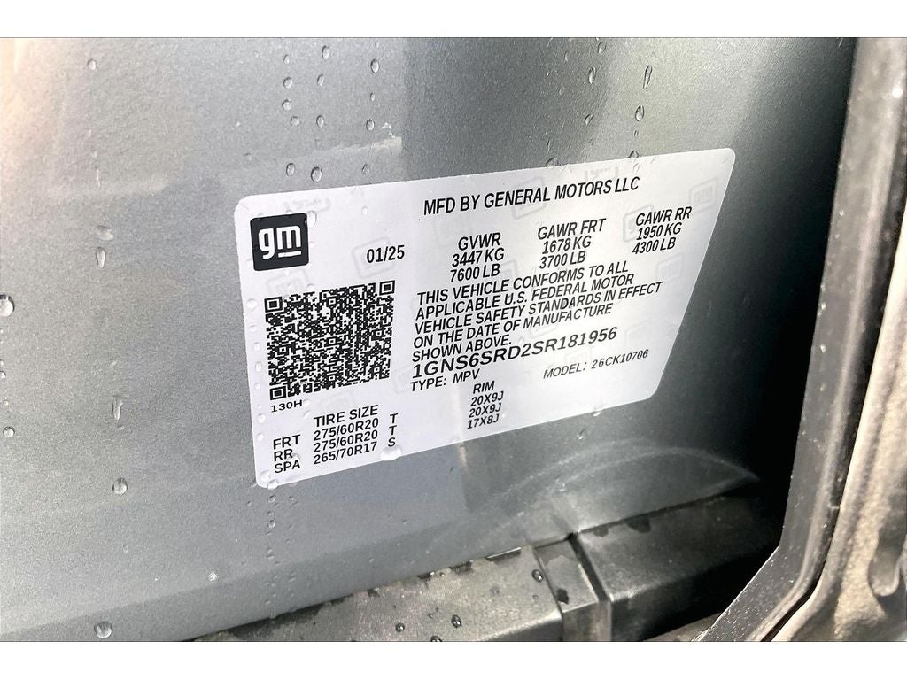 Technology & Entertainment Package: Dual-Pane Power Panoramic Sunroof; Rear Seat Media System. Advanced Security Package: Theft-Deterrent Alarm System; Vehicle Interior Movement Sensor; Vehicle Inclination Sensor; Glass Breakage Sensor. Technology Package: AutoSense Hands-Free Power Liftgate; 15" Diagonal Multi-Color Head-Up Display; Inside Rearview Auo-Dimming Rear Camera Mirror. Preferred Equipment Group 1LZ: Bright Front and Rear Door Sill Plates; 20" X 9" Polished Aluminum Wheels; Memory Settings; Remote Start; 3rd Row 60/40 Power-Folding Split-Bench Seat; Rear Power Liftgate; Chrome Door Handles with Body-Color Strip; LED Tail Lamps; Front LED Fog Lamps; Frontal Driver and Outboard Passenger Airbags; Heated Steering Wheel; Front Bucket Seats; Universal Home Remote; Color-Keyed Carpeting Floor Covering; Heated 2nd Row Outboard Seats; 1st and 2nd Row Color-Keyed Carpeted Floor Mats; Floor Console; Chrome Mirror Caps; Dual Exhaust System; 3-Spoke Wrapped Steering